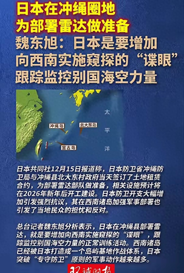 先看时间线有多密集:12月15号,日本防卫省刚跟冲绳北大东村签完合同,租下11公顷地,要在最东端的北大东岛装移动警戒雷达,还得派30个兵常驻。