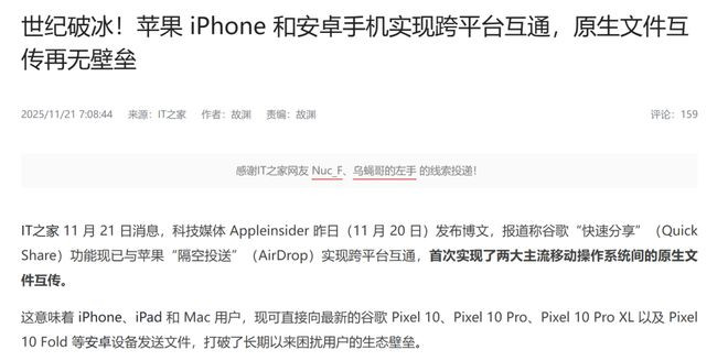先说一个对咱们消费者有好处的事儿,以后苹果和安卓设备相互换机,数据也许可以互通了。