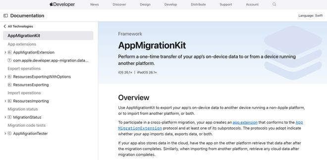 但今年10月份,苹果在自家开发者页面上悄悄整了个名叫“AppMigrationKit(应用迁移套件)”的新框架文档,也许就是冲着解决换机这件事去的。